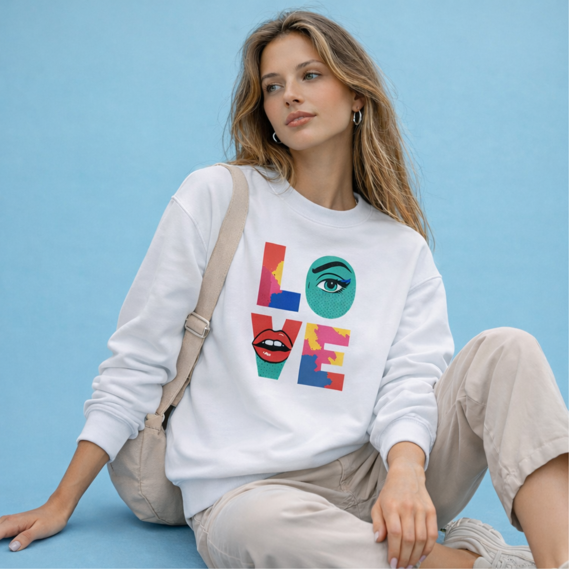 El amor hecho arte urbano. Esta sudadera blanca transforma la palabra LOVE en un diseño vibrante y lleno de carácter, con labios y un ojo al estilo pop-art que capturan la fuerza de la expresión y la energía del color. Perfecta para quienes viven el amor con intensidad y actitud moderna.