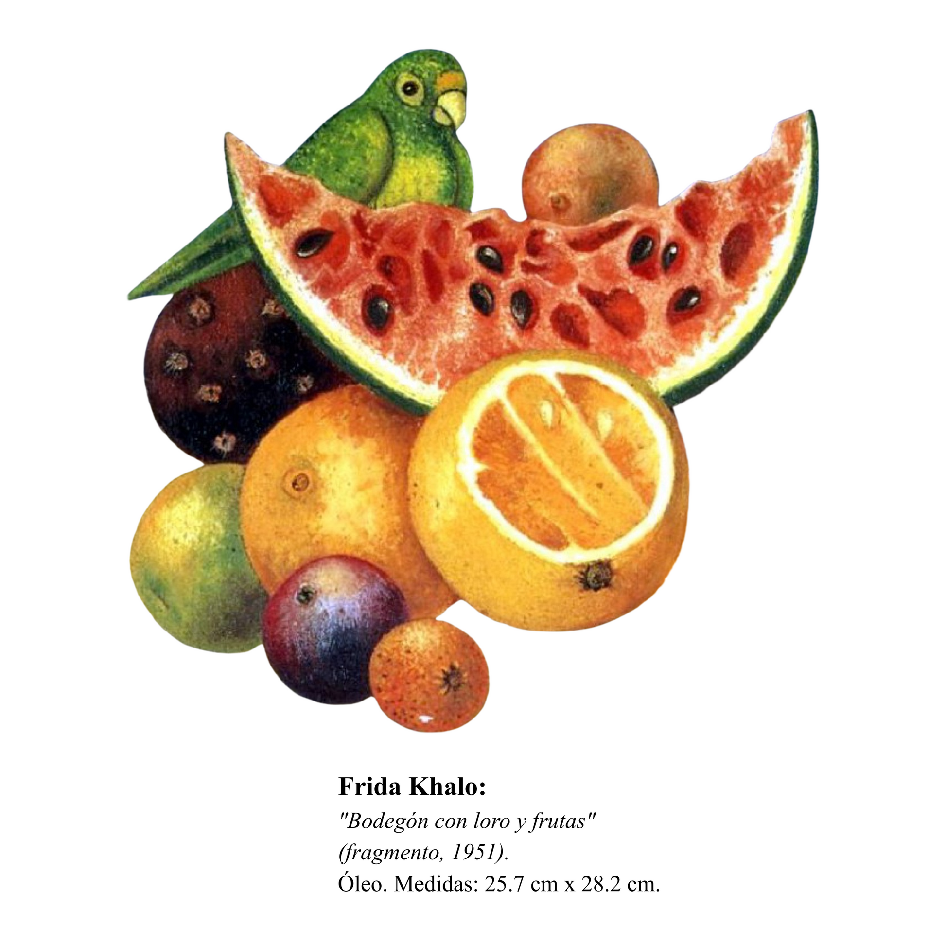 Frida pintaba lo que la rodeaba con una intensidad única. Este fragmento es pura vida: frutas, color y un loro que parece escapado de un sueño. Llevar esta tote es cargar con un pedazo de magia cotidiana y una dosis de autenticidad rebelde.
